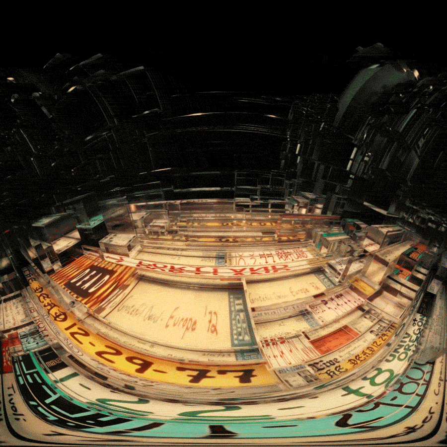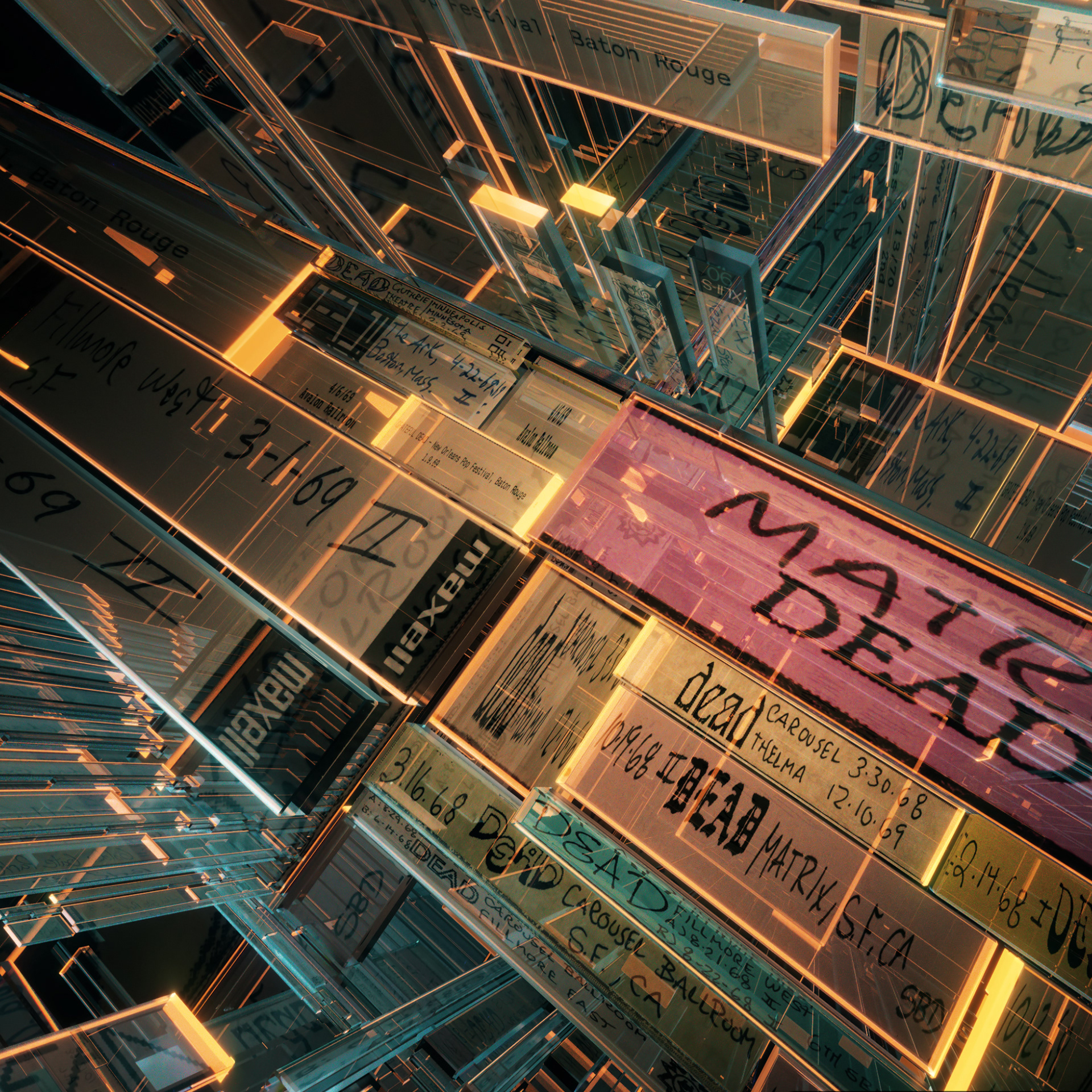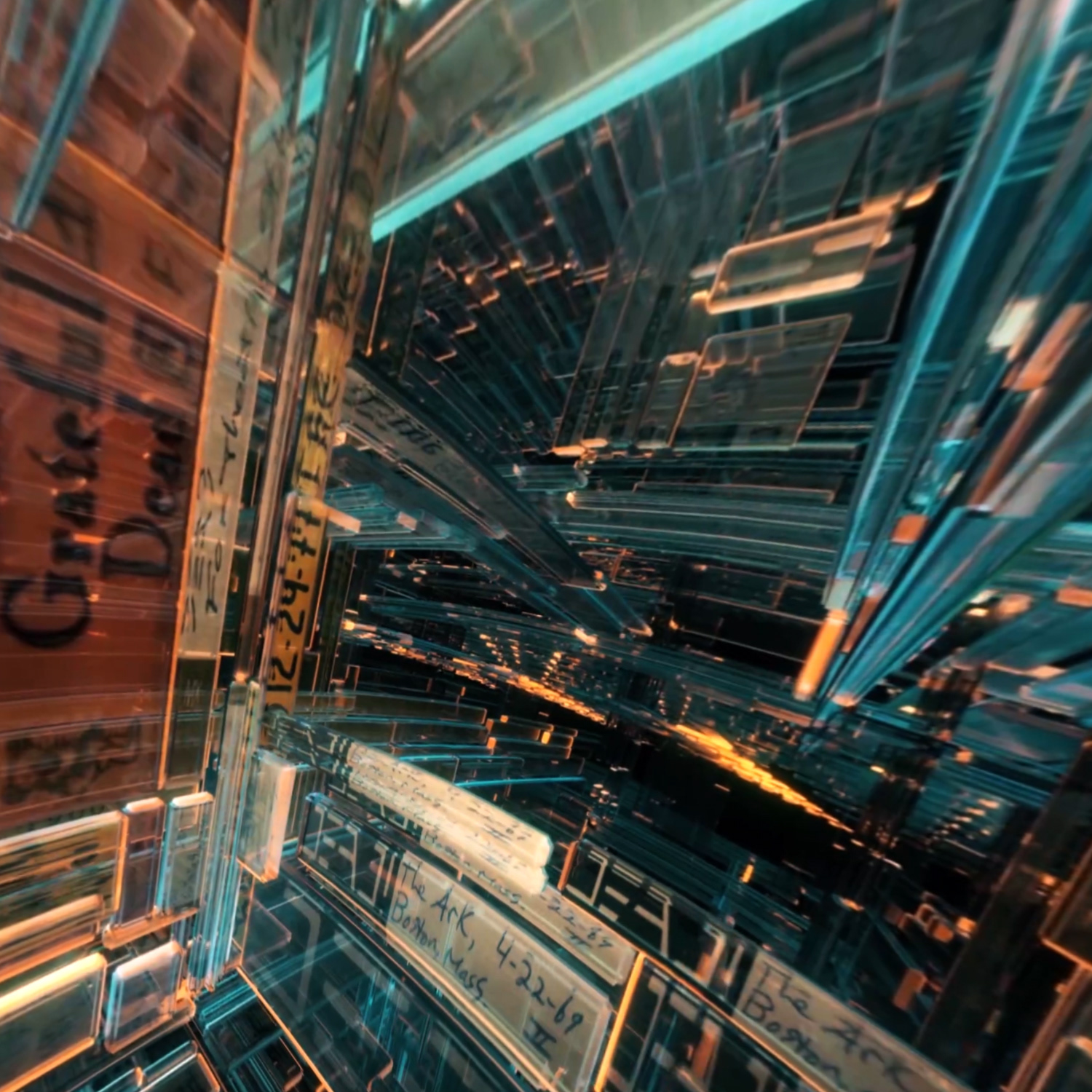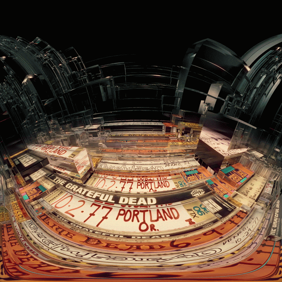 For Dead & Company's second Vegas Sphere residency, I created this sequence to celebrate sixty years of the Grateful Dead, building a fluid, ever changing archive incorporating the tape covers from hundreds of bootleg recordings over the years. A continuous 5 minute camera move takes the crowd into the molecular structure of the bands 'Steely' logo, revealing the vast array of tapes forming the structure, in chronological order. Several other initial tests also displayed above.