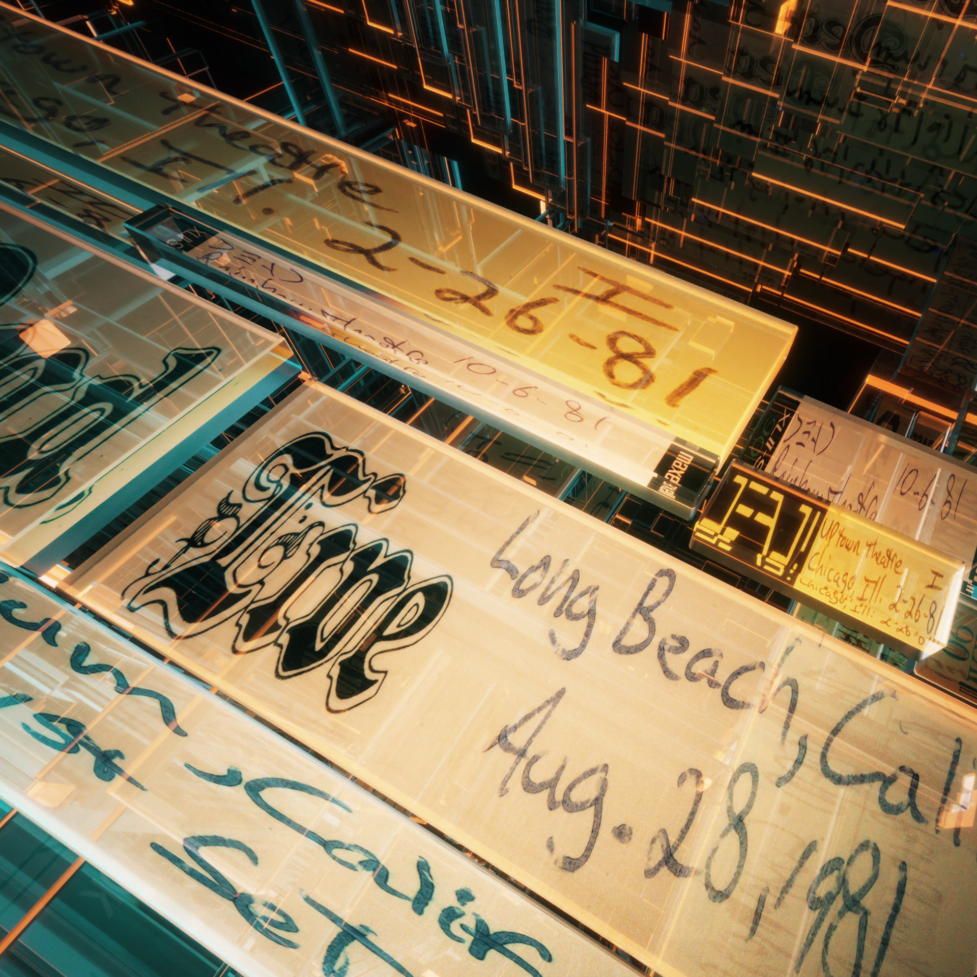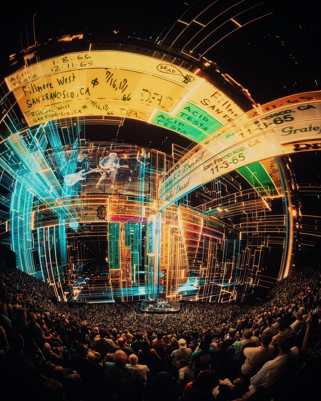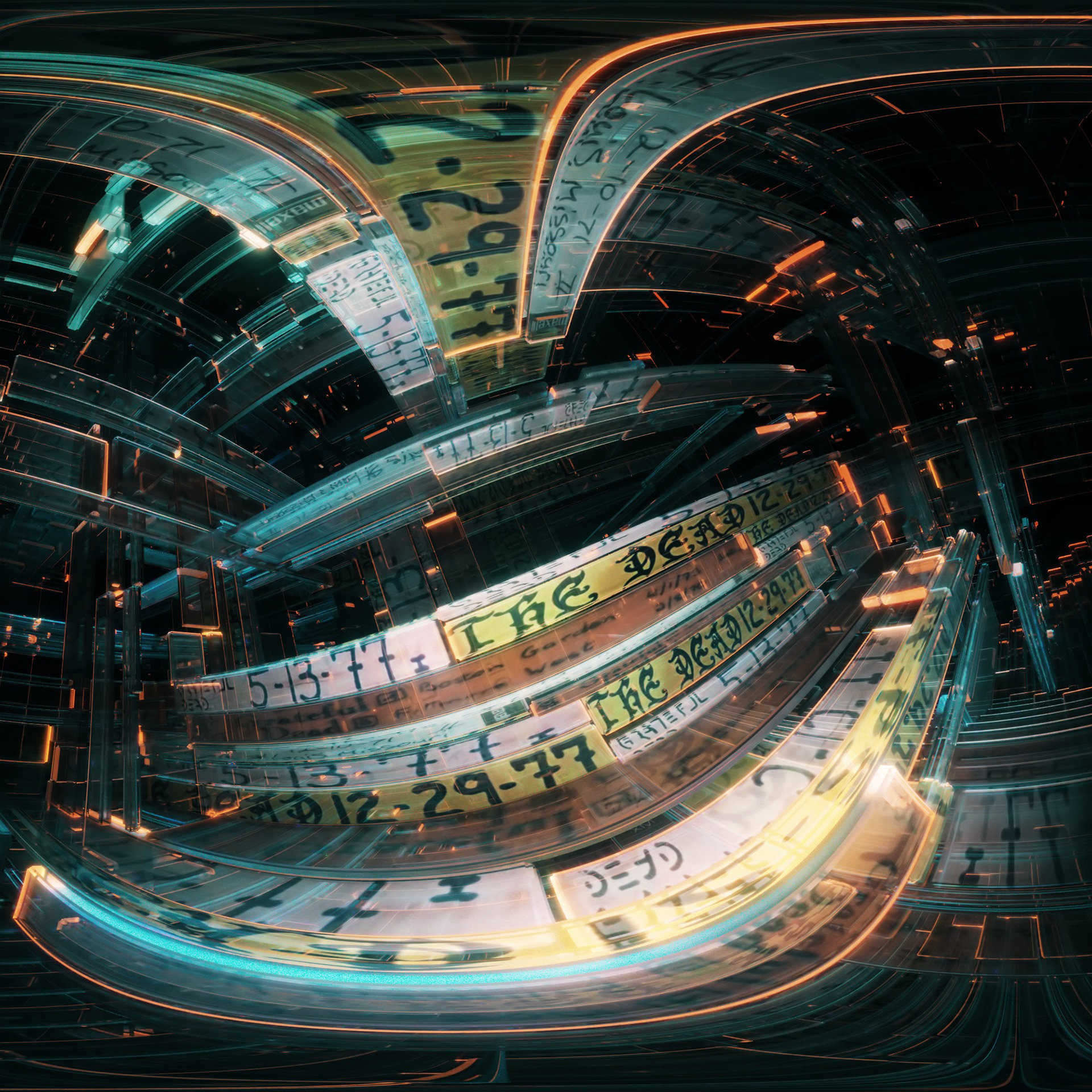 For Dead & Company's second Vegas Sphere residency, I created this sequence to celebrate sixty years of the Grateful Dead, building a fluid, ever changing archive incorporating the tape covers from hundreds of bootleg recordings over the years. A continuous 5 minute camera move takes the crowd into the molecular structure of the bands 'Steely' logo, revealing the vast array of tapes forming the structure, in chronological order. Several other initial tests also displayed above.